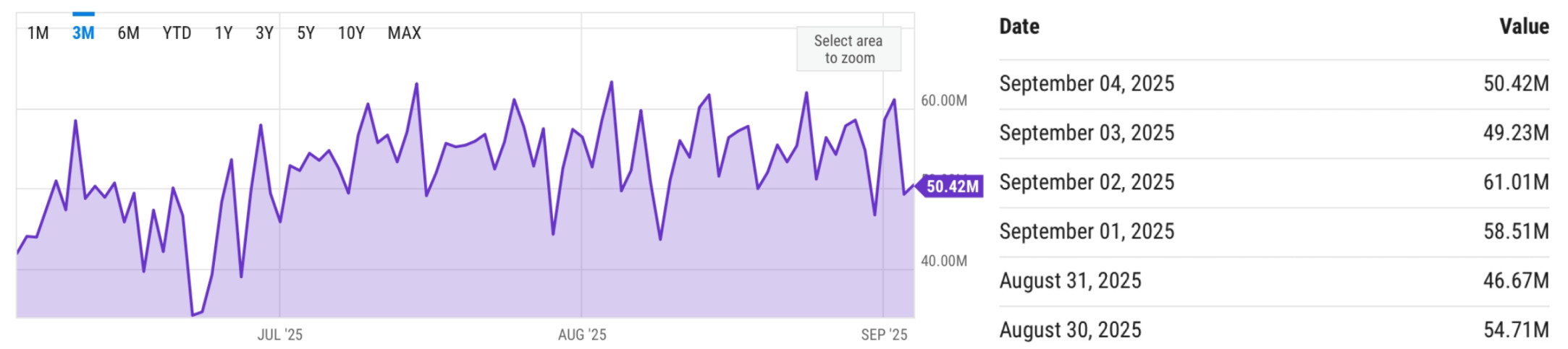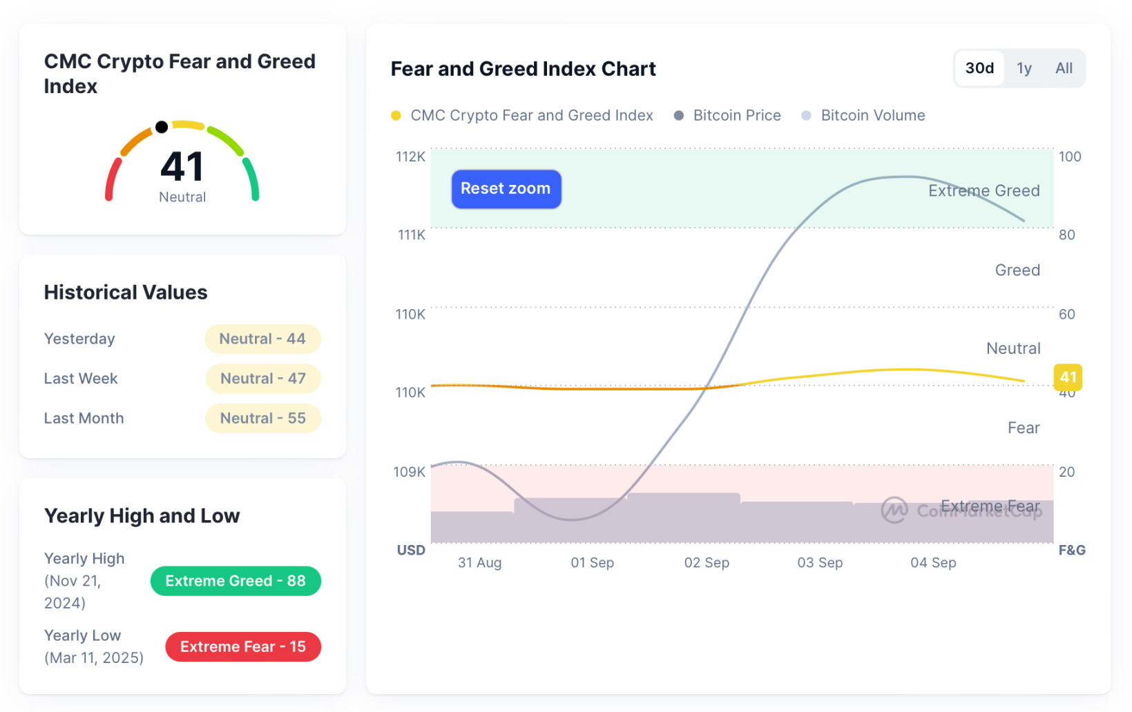 截至 9 月 5 日,恐惧与贪婪指数(Fear & Greed Index)报 41 点,位于“中性”(Neutral)区间的下沿,显示市场情绪依旧偏向谨慎,投资者整体维持防御姿态。