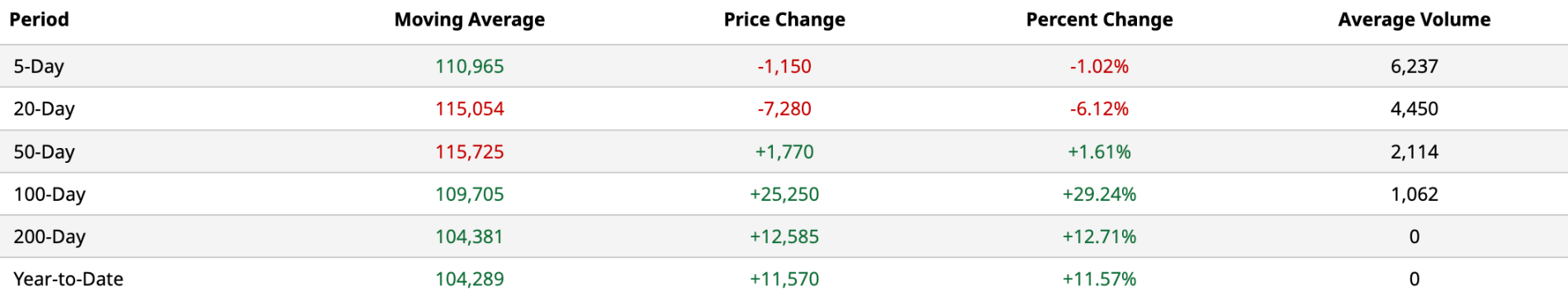 中期:若能突破 MA20 与 MA50 压力带($115,000 附近),有望重回上升趋势。