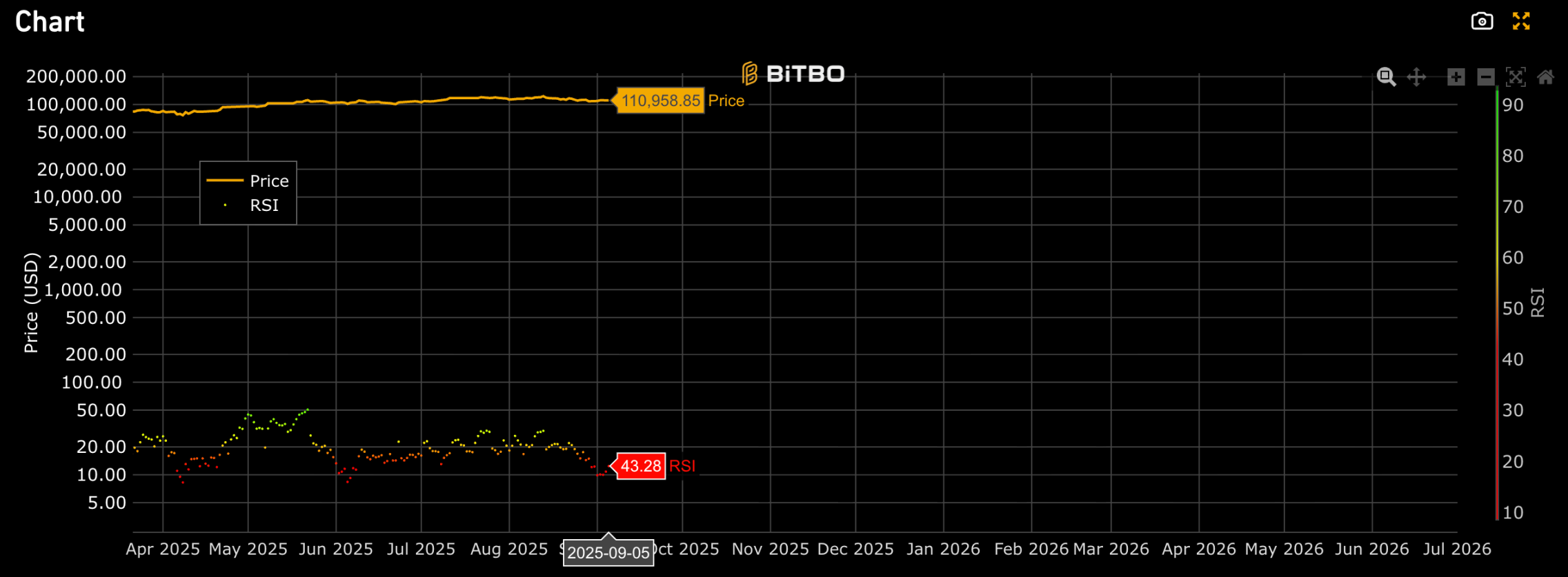 根据 Bitbo 数据,截至 2025 年 9 月 5 日,比特币 14 日 RSI 为 43.28。从区间来看,RSI 在 30–50 之间通常被视为弱势区间,意味着市场多头力量不足,空头相对占据主动。当前 RSI 值显示出比特币的短期动能偏弱,市场资金流入有限,价格表现呈现震荡下行的倾向。虽然该水平尚未触及 30 以下的超卖区域,但已显露出下行动能的压力。如果 RSI 继续向 40 附近靠拢并企稳,市场可能在该区域获得技术性支撑,从而触发阶段性反弹;然而,一旦跌破 35,将释放更强烈的看跌信号,暗示价格可能面临进一步的下探风险。总体而言,比特币在当前 RSI 区间下仍处于多头乏力的状态,投资者需要密切关注 40–35 区间的表现,以判断后续走势的强弱转换。