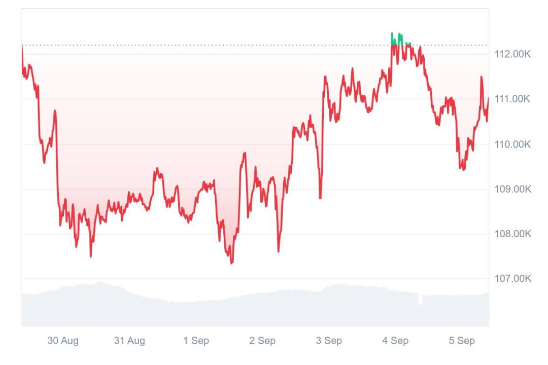 9 月 4 日,比特币一度冲高至 112,000 美元上方,随后承压回落至 110,407 美元,短暂反弹至 111,000 美元附近,最终下探至 109,411 美元才企稳。9 月 5 日,价格反弹至 111,494 美元但未能突破,截止撰稿时回落至 110,888 美元。