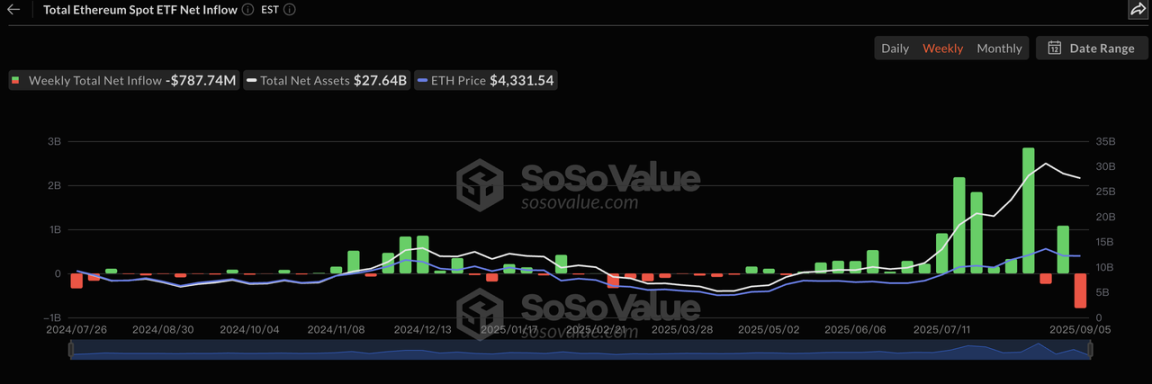 BTC 和 ETH 陷入高位盘整,在过去一周仅约维持 5%-6% 的振幅,波动较小。一部分用户可能在此期间去追逐波动率更高的 A 股或美股。另一方面,机构级别的力量正在减弱。BTC ETF 在过去一周净流入 2.46 亿美元,较为低微;而 ETH ETF 创下了最大的单周净流出,达 7.88 亿美元。