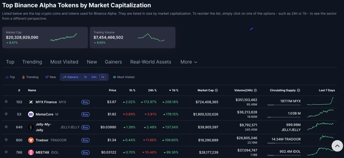 目前整个 Alpha 板块代币市值已突破 200 亿美元,有数个 BSC 资产在过一周内翻倍,其中以 MYX 和 M 涨幅最为高涨。Alpha 资产特点是上线需要支付一定的成本用于给用户空投,以及控筹程度较高,在上线的数个月里流通量通常不会太高。从链上来看,即便是高市值代币,但大额盈利的地址相对偏低,这意味着交易普遍是集中在 Alpha 内部,难以追踪,这给项目方控筹提供了良好的屏障。整体来说,Alpha 资产适合二段机会,上线低流通,通过一定的时间把用户空投逐渐收回来以进一步加强控筹水平,后续配合行情或者利好拉升。