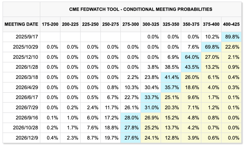 市场对 9 月降息预期持续升温,市场已不存在对维持利率不变的任何预测。目前 CME FedWatch 预计美联储在本月 17 日的 FOMC 会议上降息至 400–425 个基点的概率为 89.8%。值得一提的是,上周美国 8 月新增非农就业只有 2.2 万人(此前市场预测是 7.65 万人),创下了 2022 年年末以来最疲软的月度增幅之一;失业率则升至近 4 年新高的 4.3%。美国劳动力市场显示出疲态,但特朗普在上月把劳工统计局局长解雇,称数据造假。