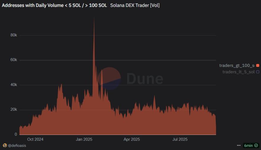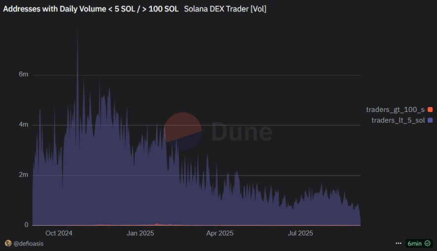 每日交易量大于 100 SOL 的 Solana DEX 交易者的数量十分稳定,从去年 10 月至今,日常大致维持在 2 万个地址。相反,每日交易量小于 5 SOL 的交易者地址数量则从去年 10 – 11 月后持续下滑,从超过 500 万下降至约 100 万上下浮动。Solana 上大户的链上购买力是依旧存在的,而散户的动能在持续衰减。