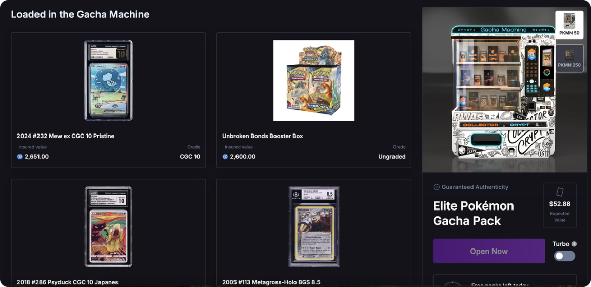 以 Collector Crypt 的扭蛋机系统(Gacha)是平台的核心玩法,用户花费约 50 或 200 美元进行抽卡,能抽取到不同等级 / 不同价值的宝可梦 NFT 卡牌。根据官方概率,用户有约 80% 的几率抽到价值低于或等于成本的卡牌,但也有小概率抽中价值上千美元的稀有卡,这种以小博大的机制极具吸引力。平台设计了一个高效的价值回收闭环。如果抽到不满意的卡牌,用户可以立即以 85% 的折扣价将其卖回给平台,换取资金继续游戏,极大地提高了用户的参与度和资金周转率。用户如果希望拿到实体卡,可以通过燃烧 NFT 并支付一些手续费进行实物赎回。