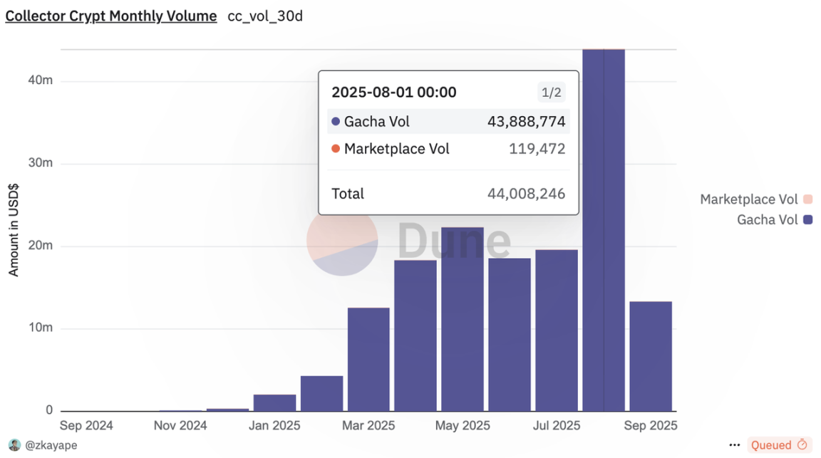 这一模式的吸金能力极其惊人。自今年 1 月推出以来,Collector Crypt 的月度总销售额从 207 万美元一路飙升至 8 月份的 4400 万美元。其中,Gacha 业务贡献了 4388 万美元,占据了绝对主导地位。相比之下,其二级卡牌市场(Marketplace)的月交易额仅为 11.9 万美元,几乎可以忽略不计。
