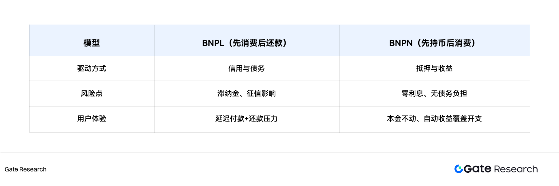 ● BNPN(Buy Now Pay from Yield)模式: PayFi 引入一种全新的“边持有、边消费、边增值”的金融模型。用户可以将加密资产进行抵押,并用产生的收益来覆盖消费开支。这种基于收益驱动的支出方式,与传统的 BNPL(Buy Now Pay Later,先消费后还款)模式形成鲜明对比: