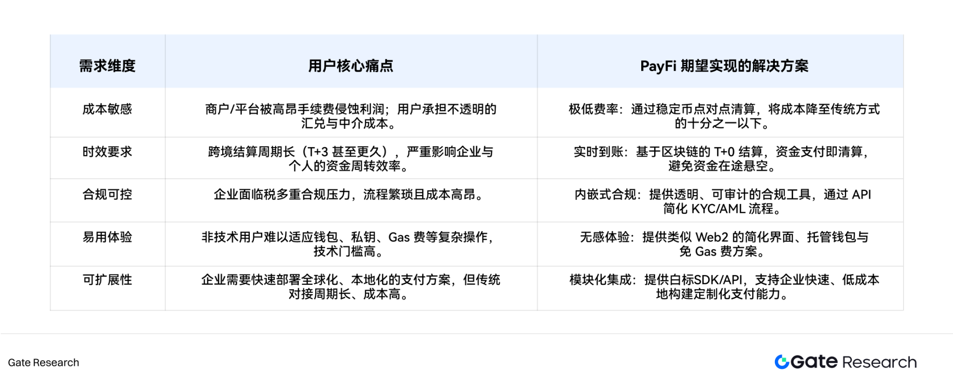 无论是出海企业、跨境自由职业者,还是 Web3 原生用户,他们对支付的核心诉求高度一致,可以归纳为五个关键维度。这不仅描绘了理想支付系统的轮廓,也指明了 PayFi 的创新方向。