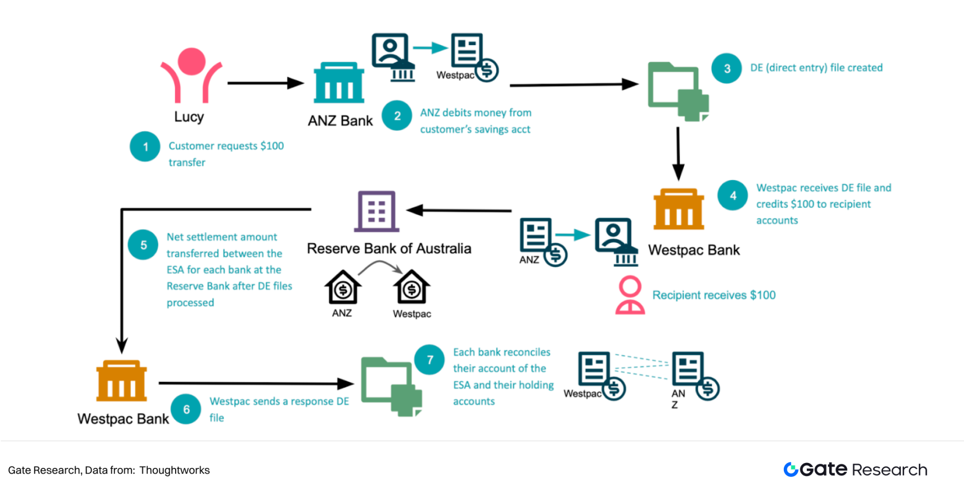 传统支付系统的清算周期普遍为 T+1 至 T+3,跨境交易甚至需要 2–5 天。这种漫长的等待不仅影响了跨境卖家和自由职业者的资金周转,还可能因资金“悬空”而错失商业机会。例如,一笔从 ANZ 银行到 Westpac 银行的转账,从发起请求到收款人到账,可能需要三天时间。
