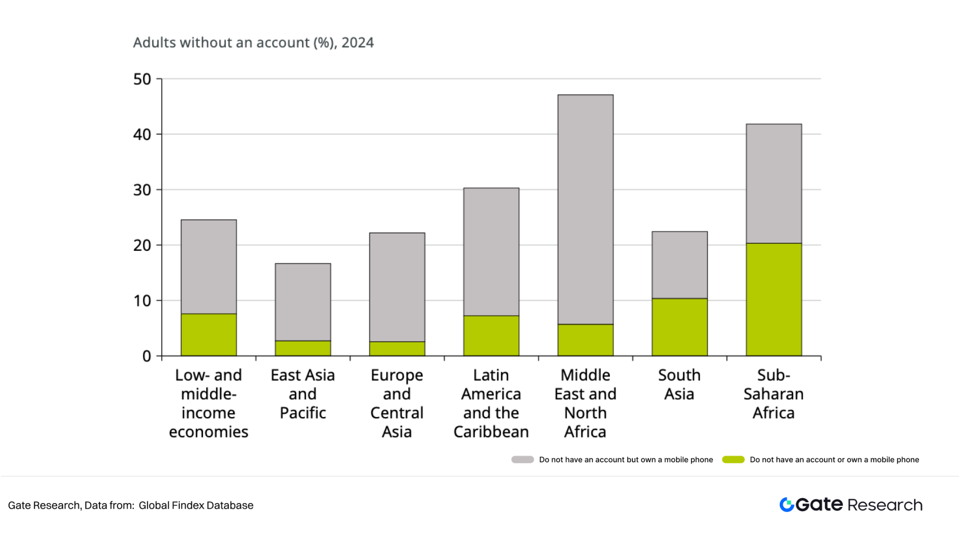 根据世界银行 Findex 数据,全球约 32% 的成年人没有银行账户,主要分布在非洲、拉丁美洲、东南亚、中东等地区。对于缺乏固定住址、稳定收入或传统信用记录的用户,难以通过银行注册与身份验证,被排除在主流金融体系之外。传统支付体系的“账户为中心”模式,要求用户先拥有银行账户才能参与支付,这对庞大的“无账户群体”(Unbanked)而言,几乎是无法跨越的门槛。