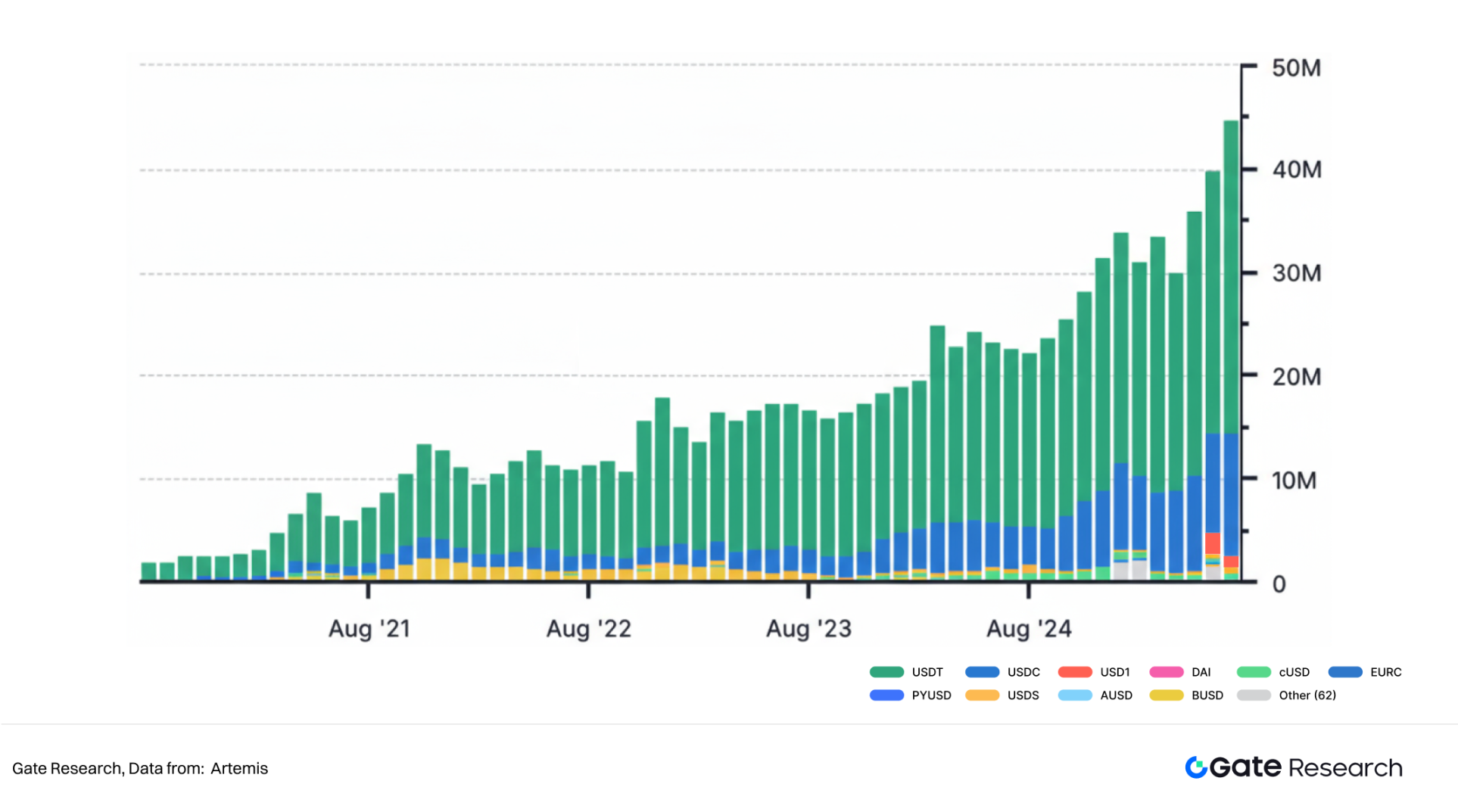 这些机构的真金白银投入,伴随着稳定币市场的强劲增长,共同构成了加密支付蓬勃发展的坚实基础。根据 Stablewatch 数据,全球美元稳定币总市值自 2019 年初的约 50 亿美元增长至 2025 年的 2,600 亿美元,增长逾 50 倍。其中,用于支付的稳定币资产占比高达 99%,支付类稳定币总市值也突破 2,600 亿美元。目前,每月有超过 4,000 万个地址在公共区块链上使用稳定币进行交易。