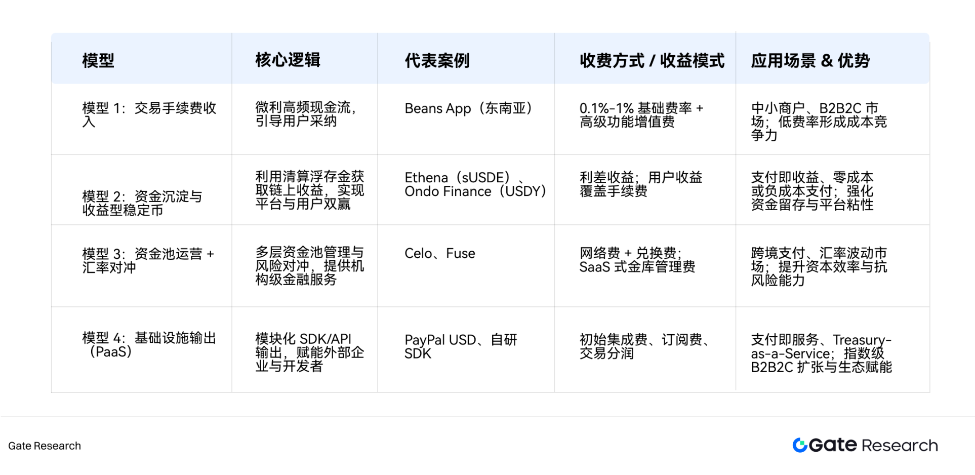 ● 四大核心商业模式:PayFi 的商业模式多层次、递进式,通过四大引擎创造收入并驱动增长。首先,以“微利高频”为核心,通过收取极低交易手续费吸引大量用户,建立稳固的现金流基础。其次,PayFi 利用清算过程中产生的资金沉淀,将其投资于收益型稳定币,为平台和用户创造收益,形成盈利飞轮。在此基础上,PayFi 提供专业金融服务,如机构级资金池管理和汇率对冲,以获取更高价值收入。最终,PayFi 将核心能力模块化,以基础设施即服务(PaaS)形式输出给其他企业,实现生态扩张和收入增长。