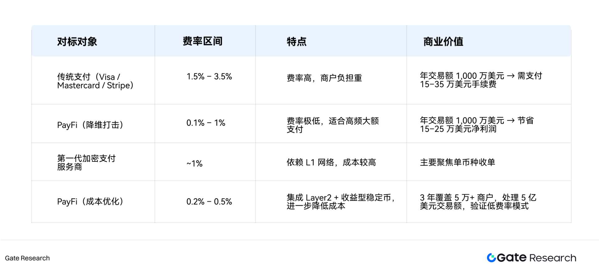 综上所述,PayFi 的 TAM 可以清晰界定为:到 2032 年,该市场将由数十万亿美元的年交易量支撑,并形成一个潜在的万亿美元服务收入池。PayFi 的真正机遇在于,它不仅能处理交易,更能通过优化成本结构和重构支付价值链,重新分配这万亿美元级别的利润空间。