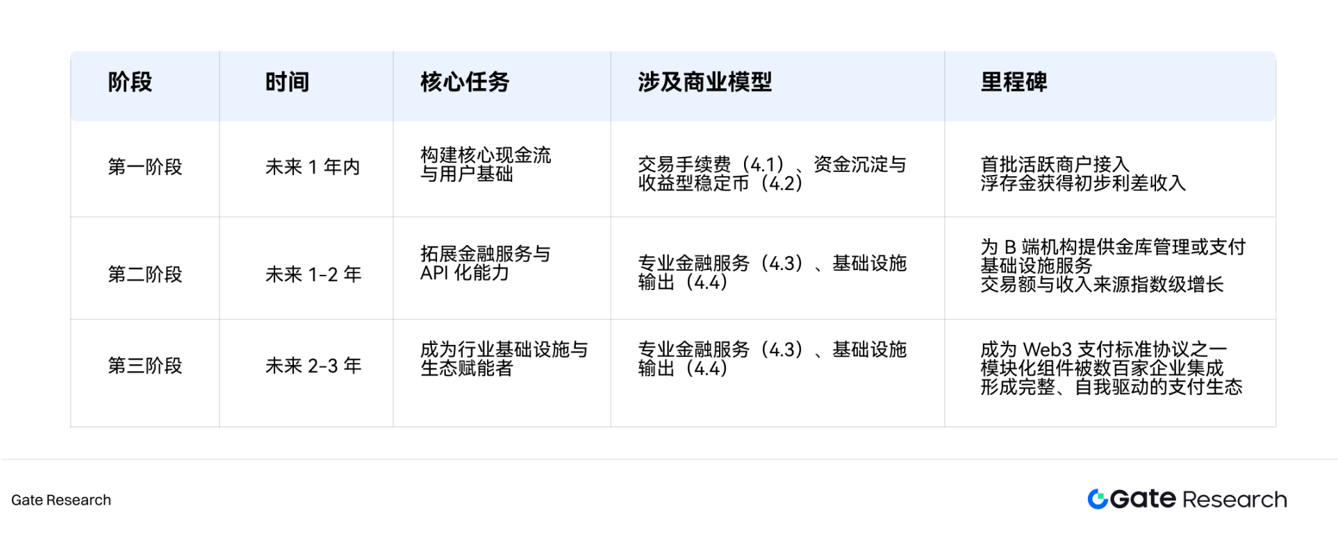 基于“手续费、资金沉淀、专业金融服务、基础设施输出”这四大商业模型,PayFi 的未来 1-3 年落地路径将采取三阶段递进式策略,确保从基础业务到生态赋能的稳健发展。