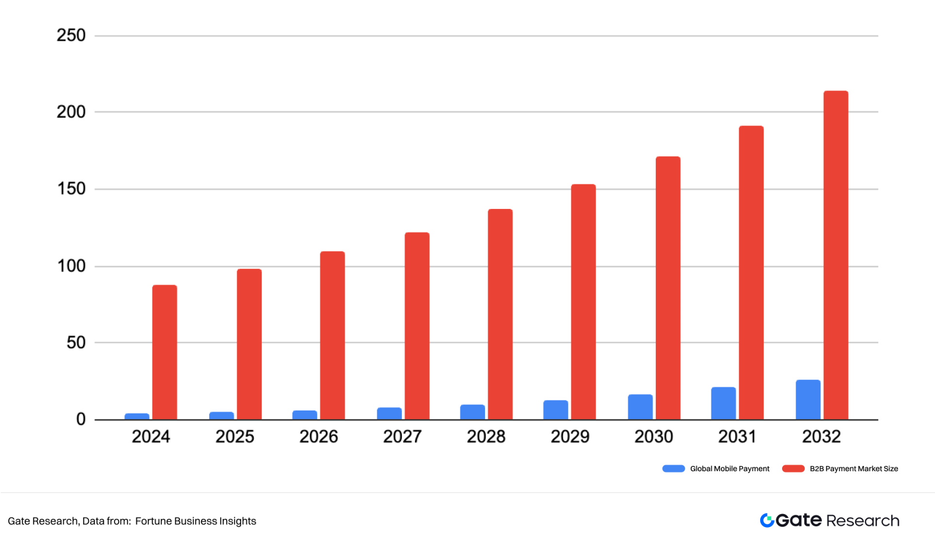 如果参考全球数字支付市场在 2032 年达到 26.53 万亿美元 的预测规模,即便加密支付的渗透率初期较低,其潜力依旧巨大: