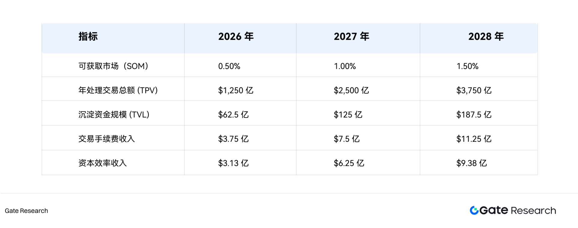 SOM(可获取市场)旨在基于 PayFi 的 GTM(Go-to-Market)战略、竞争优势和市场采纳速度,测算其在特定时间范围内能够实际占有的市场份额及相应的收入潜力。