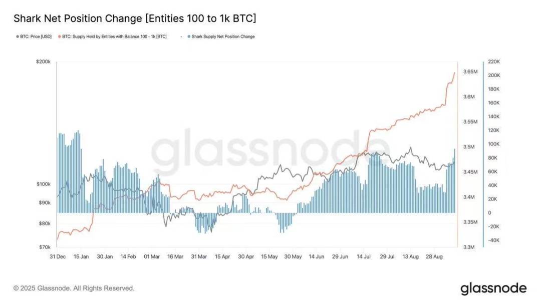 9 月 11 日消息,据 glassnode 数据,持有 100 至 1000 枚比特币的实体在过去 7 天内大幅增持,新增约 6.5 万枚 BTC。