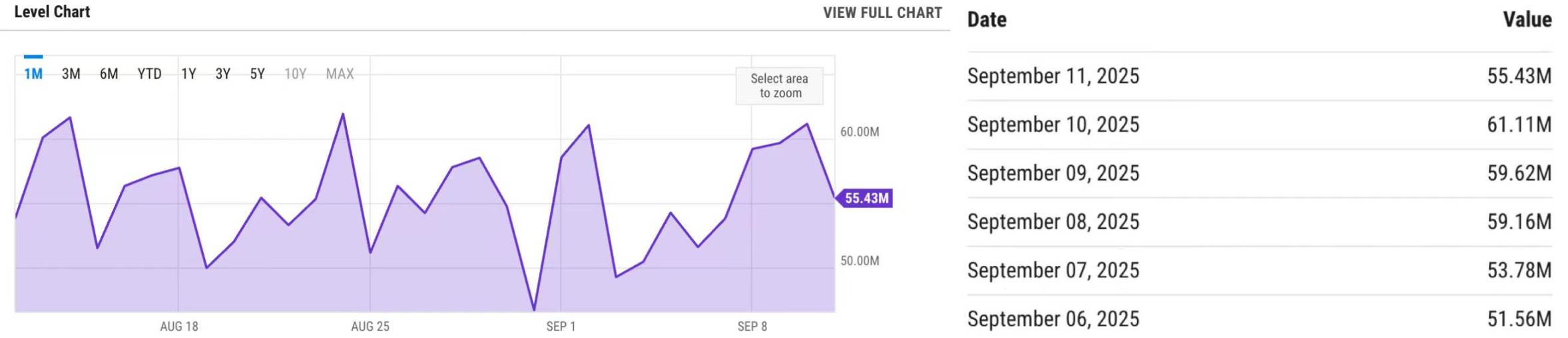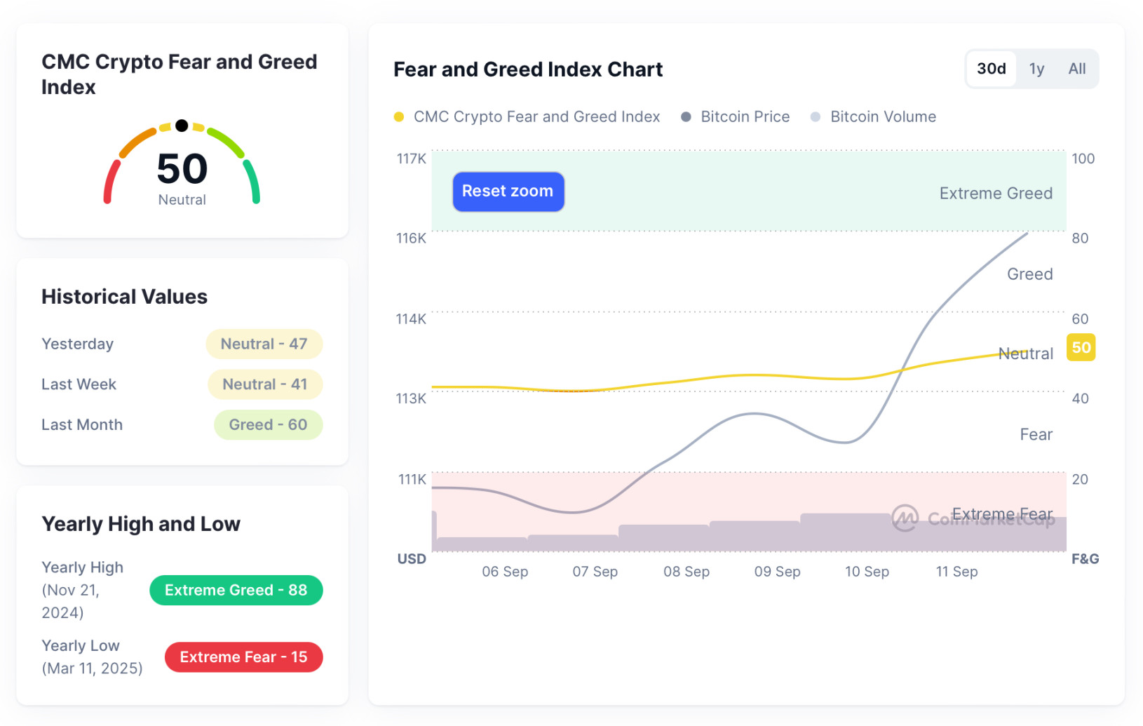 截至 9 月 12 日,恐惧与贪婪指数(Fear & Greed Index)报 50 点,位于“中性”(Neutral)区间,显示市场整体情绪相对平稳,投资者情绪既不偏向恐惧,也未明显贪婪。