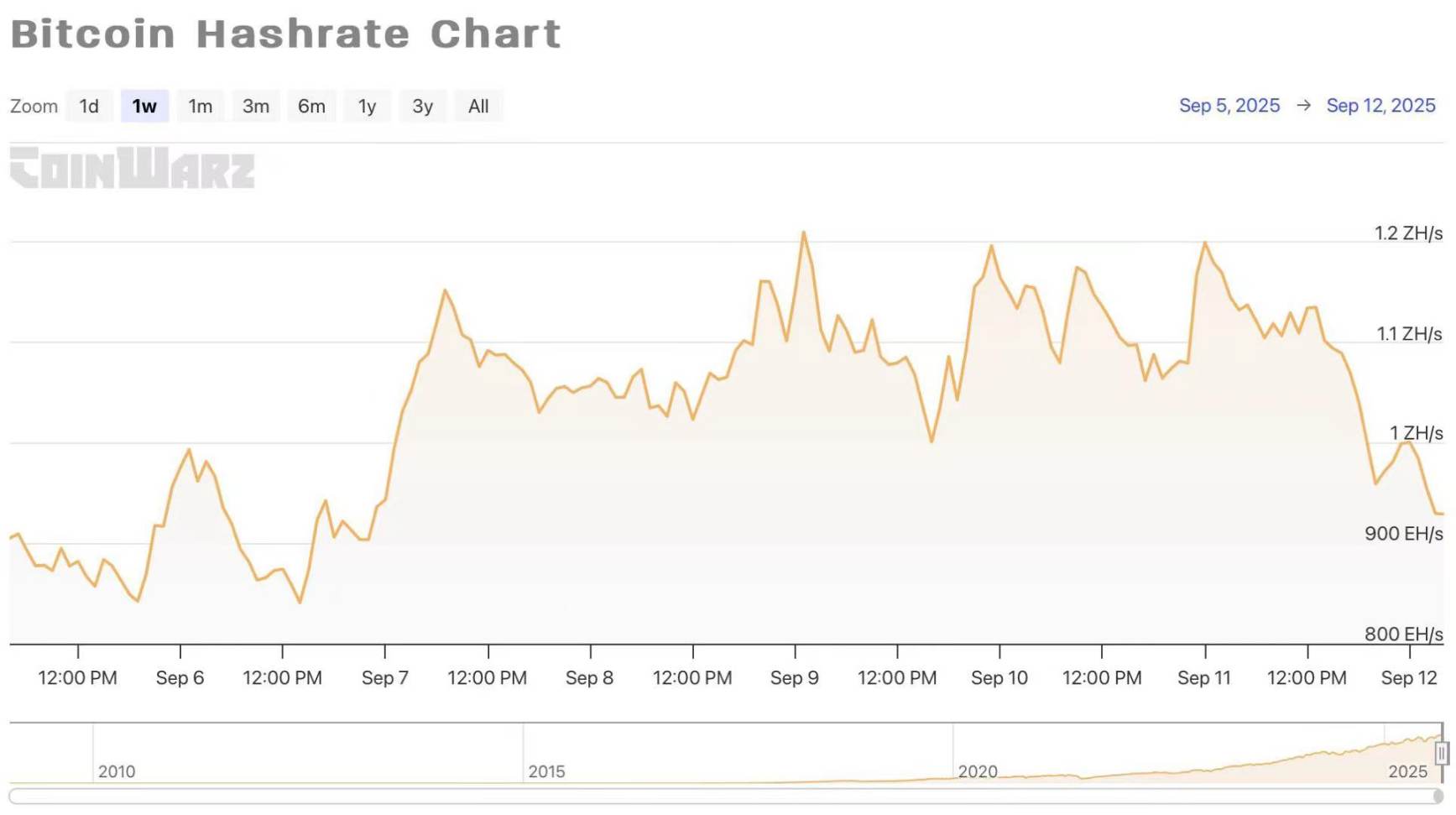 9 月 6 日,哈希率维持在 840 EH/s -1 ZH/s 区间内波动,处于相对低位。9 月 7 日,网络算力显著上升,哈希率攀升至 1.1524 ZH/s,显示出矿工在该时点加速投入算力。随后 7 日至 8 日,哈希率维持在 1.05 ZH/s 附近。8 日晚间至 9 日,算力进一步攀升,攀升至至 1.2102 ZH/s。9 月 9 日至 11 日,早间哈希率整体运行在 1.05 ZH/s – 1.2 ZH/s 区间,午后哈希率回落降至 959.21 EH/s。9 月 12 日,哈希率继续回落,截至撰稿时回落至 930 EH/s 附近。