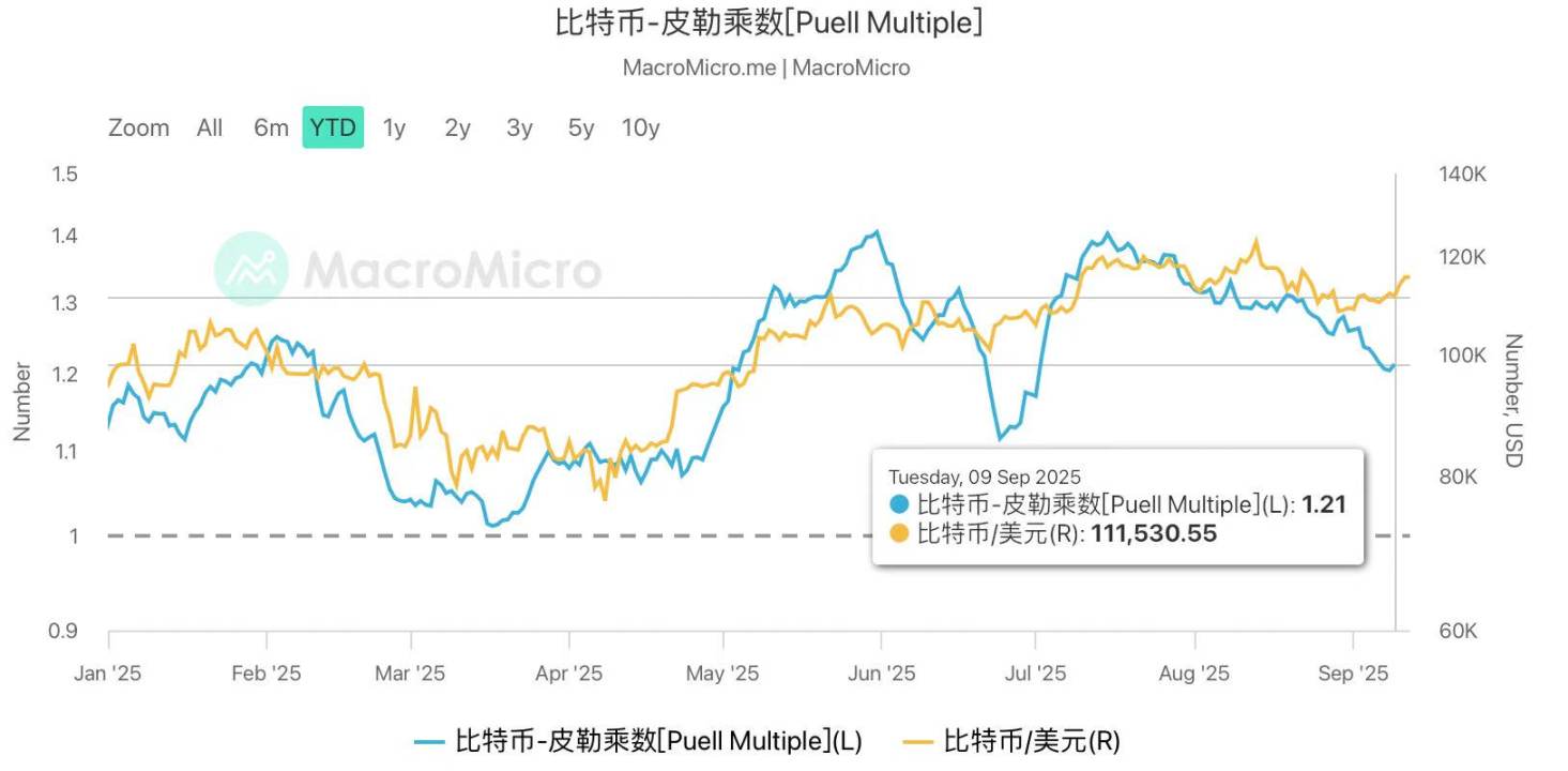 同时,链上指标 Puell Multiple ( 比特币 - 皮勒乘数 ) 有所下降,维持在 1.20–1.21 区间。Puell Multiple 是通过比较每日比特币发行价值与其年度平均发行价值的比率,用于衡量矿工盈利水平和市场过热程度。
