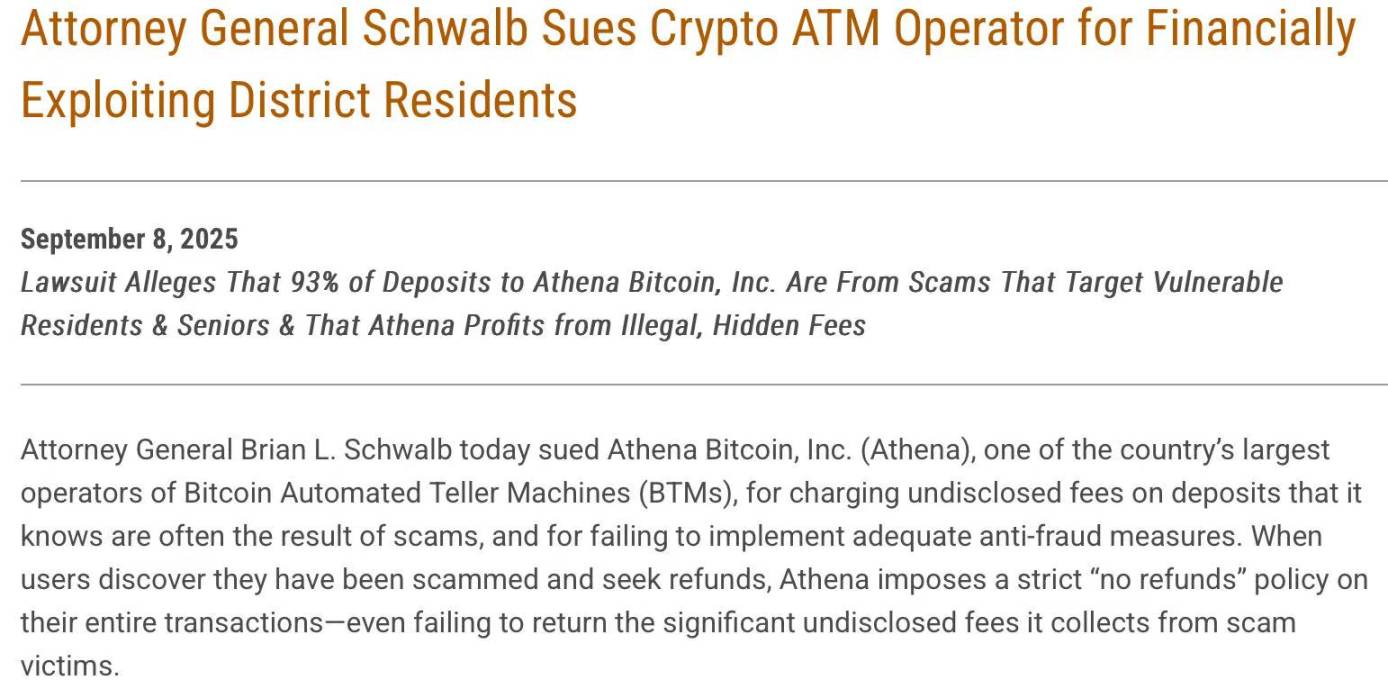 9 月 9 日消息,华盛顿特区总检察长布莱恩·施瓦布于 2025 年 9 月 8 日对比特币 ATM 运营商 Athena Bitcoin, Inc. 提起诉讼,指控该公司从针对老年人和弱势群体的金融诈骗中非法获利。