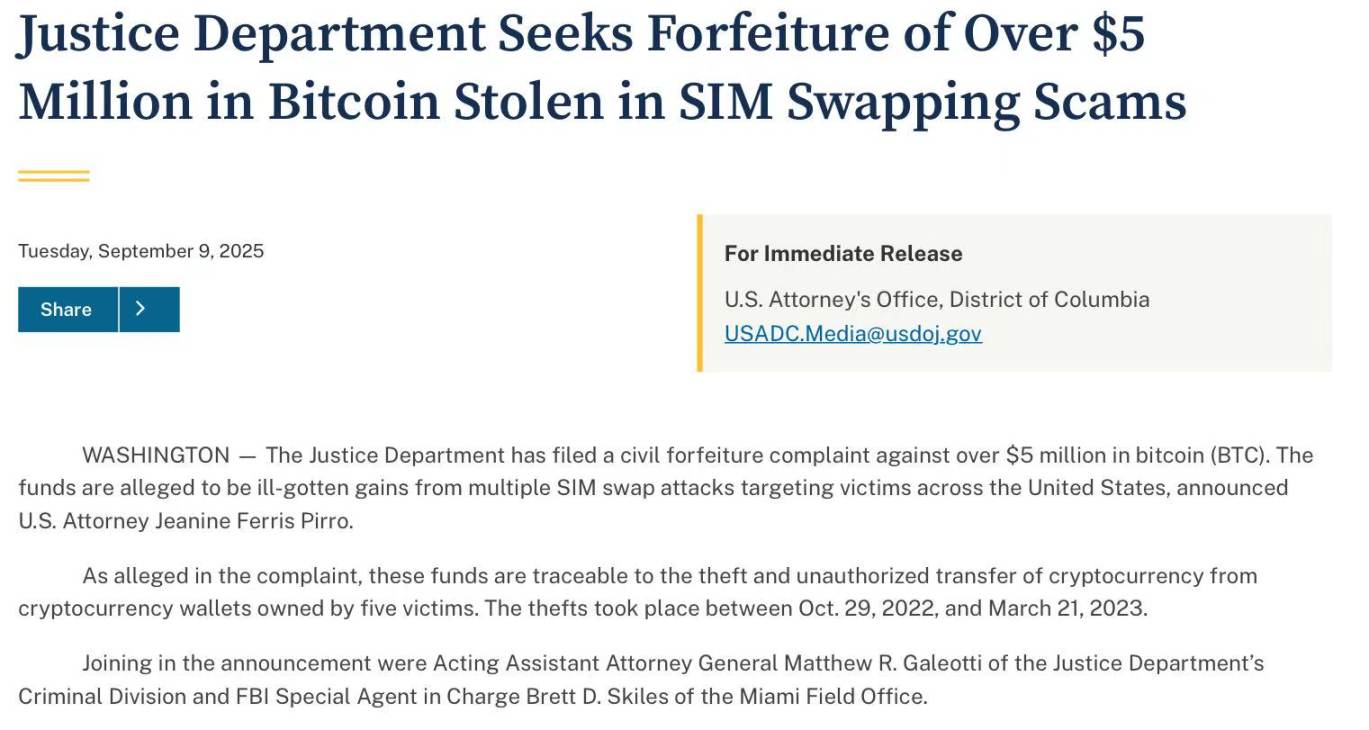 美国司法部寻求没收多起 SIM 卡攻击案件中被盗的比特币,价值超 500 万美元