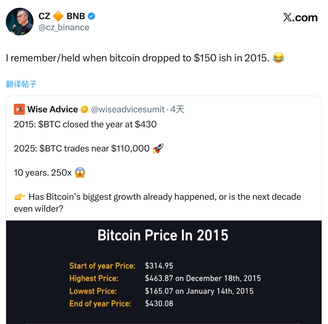 9 月 6 日消息,币安联创赵长鹏在 X 平台发文表示:“在 2015 年,我记得且持有比特币,当时比特币价格跌至 150 美元左右。”