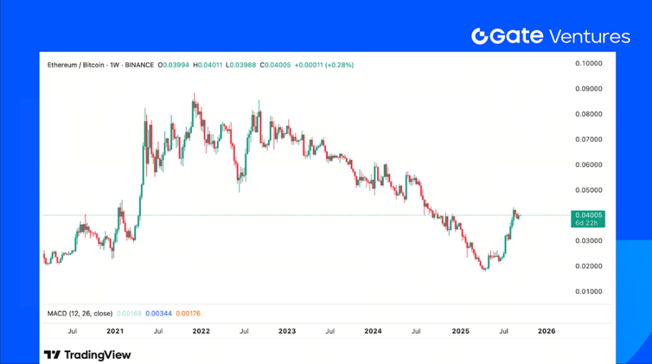Given ETH’s stronger performance relative to BTC, the ETH/BTC ratio edged up slightly to 0.04.