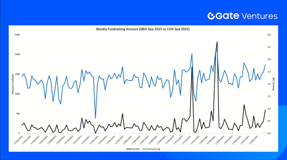Total weekly fundraising rose to $594M for the 2nd week of Sep-2025, an increase of +95% compared to the week prior. Weekly fundraising in the previous week was up +81% year over year for the same period.