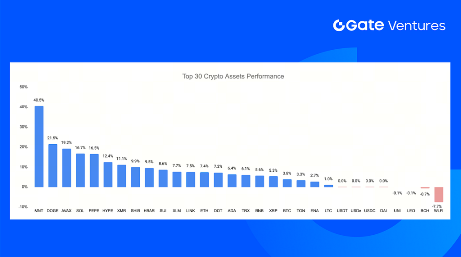 Dogecoin (DOGE) ranked second with ~20% gains, fueled by renewed headlines around the launch of a DOGE ETF, despite the approval process being delayed once again. (7, 8)
