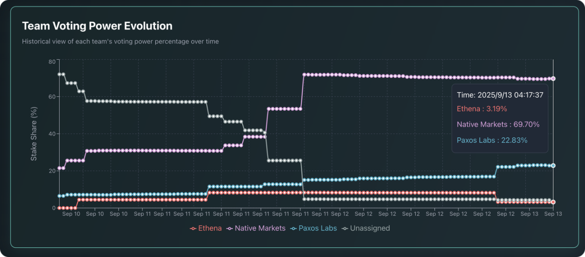 Native Markets 的创始人深度嵌入生态,技术方案有备而来,这些都向社区传递了一个清晰的信号。在这场对决中,验证者用选票证明:对于 Hyperliquid 而言,纯粹的生态忠诚度,其价值远超老牌发行商所能提供的现成规模与经验。毕竟,对于验证节点来说,一个完全忠于 Hyperliquid、没有任何外部利益冲突的团队,对于维护网络主权至关重要。