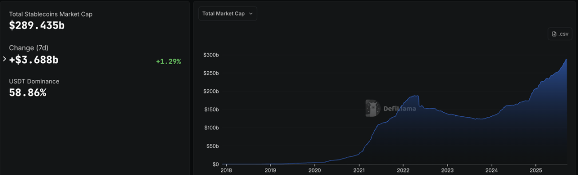 稳定币供应继续稳健增长,全网稳定币市值已逼近 $290B。过去一周,USDT 增供约 $1.44B,USDC 增加 $683M;收益型稳定币 USDe 本周在 Binance 现货上线,供应量激增 $794M。稳定币供应两翼齐升,表明资本依旧偏好通过稳定币进入加密市场,增补了风险偏好回暖基础。
