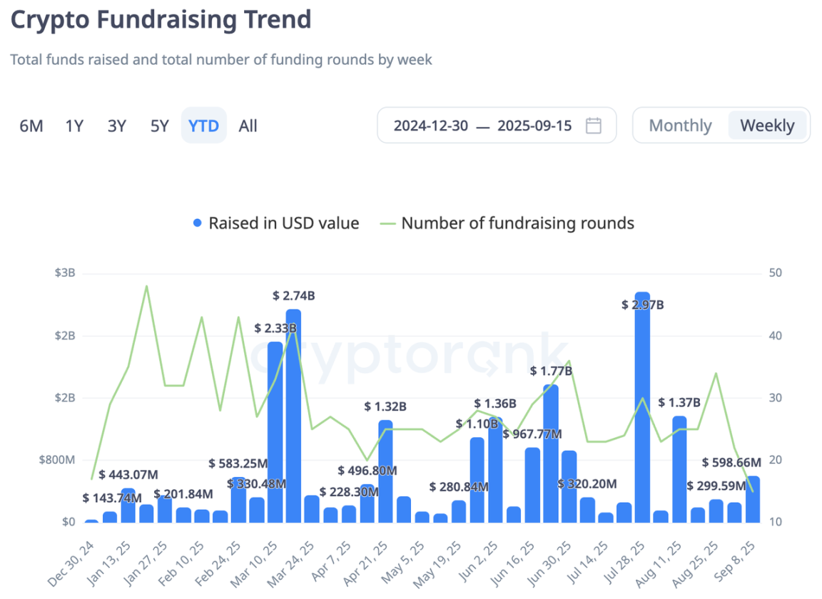 上周一级市场融资略有改善,总额达约 $598M,主要集中在 IPO 融资领域。周内,聚焦数字资产的财库公司 Eightco Holdings(OCTO)成功完成 $270M 私募融资,资金将用于其 Worldcoin 财库战略部署。区块链私募股权基金 Inversion Capital 宣布完成 $26.5M 种子轮,领投方包括 Dragonfly、VanEck、ParaFi Capital、Mirana Ventures 和 HashKey Capital。