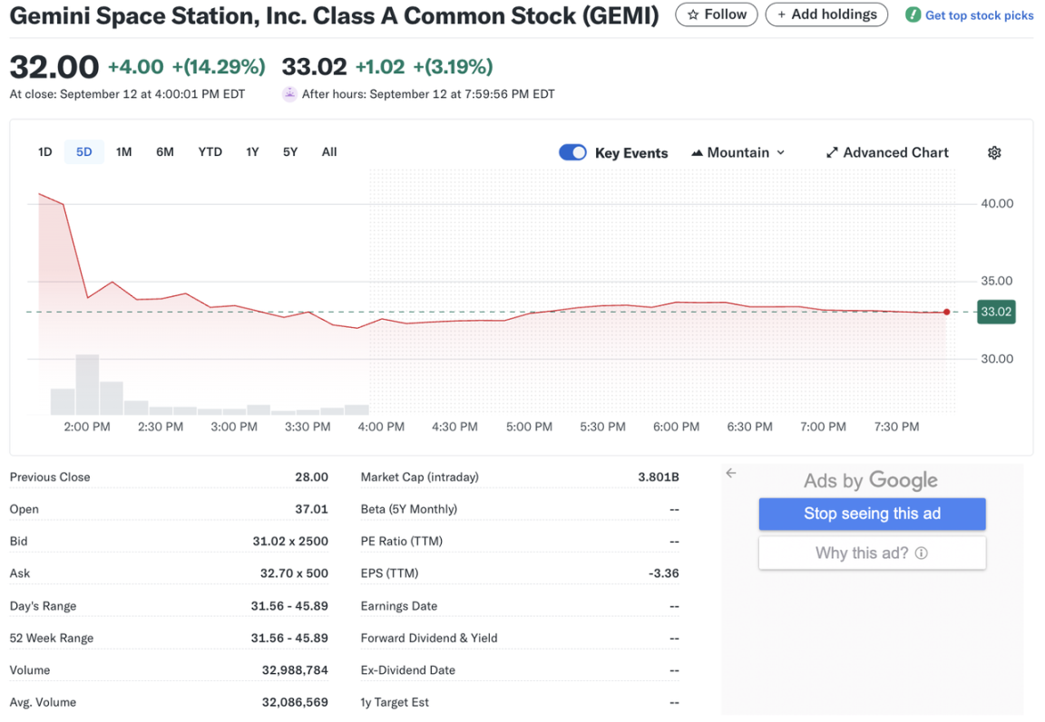 继 Figure 股价强劲表现后,9 月 13 日(周五),由 Winklevoss 兄弟创办的加密货币交易所 Gemini Space Station Inc.(股票代码:GEMI)也在纳斯达克上市。Gemini 此次 IPO 筹集 4.25 亿美元,估值约为 33 亿美元。其发行价高于此前推介区间,同时缩减了发行规模,获得超过 20 倍的超额认购。GEMI 当日开盘报价 37.01 美元,较 28 美元发行价上涨 32.2%,盘中一度涨至 45.89 美元(涨幅扩大至 63.9%),最终收报 32 美元,涨幅 14.3%。据报道,超过 20% 的 Gemini IPO 股份分配给散户投资者,包括通过线上券商平台和定向亲友配售计划。
