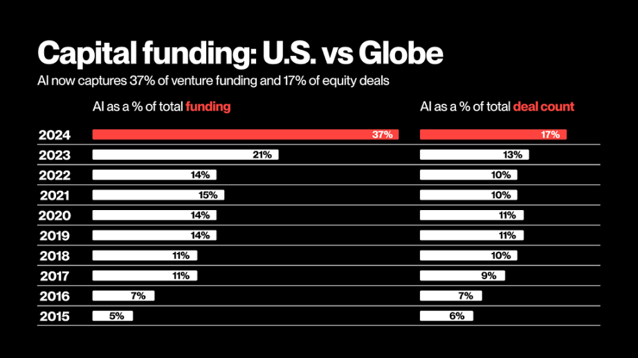 2022 年 11 月是个关键节点,这一时期 FTX 崩盘引发行业震荡,与此同时,ChatGPT 3.5 向公众发布,此后人工智能领域的投资出现激增,目前人工智能投资已占到风险投资总额的 37%。美国风险投资呈现爆炸式增长,而机构对创新技术的积极采用更是进一步加速了这一态势。那些在美国境外运营的加密和人工智能项目,不仅面临着比美国公司更为严峻的监管障碍,而且由于《让 401(K) 投资者能够获得另类资产》的行政命令的通过,它们还无法触及美国这一庞大的资金来源。