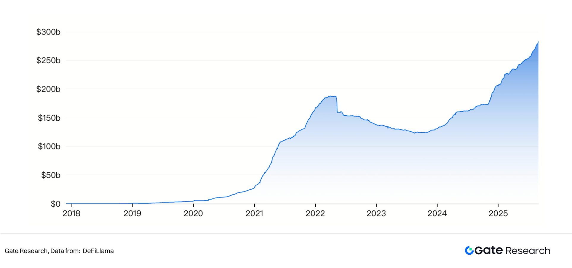 截至 2025 年 8 月,稳定币市场已成为加密生态中增长最快、最核心的板块之一。在短短六年内,其总市值从 2019 年初的 4.18 亿美元增长超过 660 倍,突破 2,800 亿美元,占加密总市值的 7% 左右。这一爆发式增长不仅体现在市值上,更反映出稳定币作为“链上美元”的广泛应用。