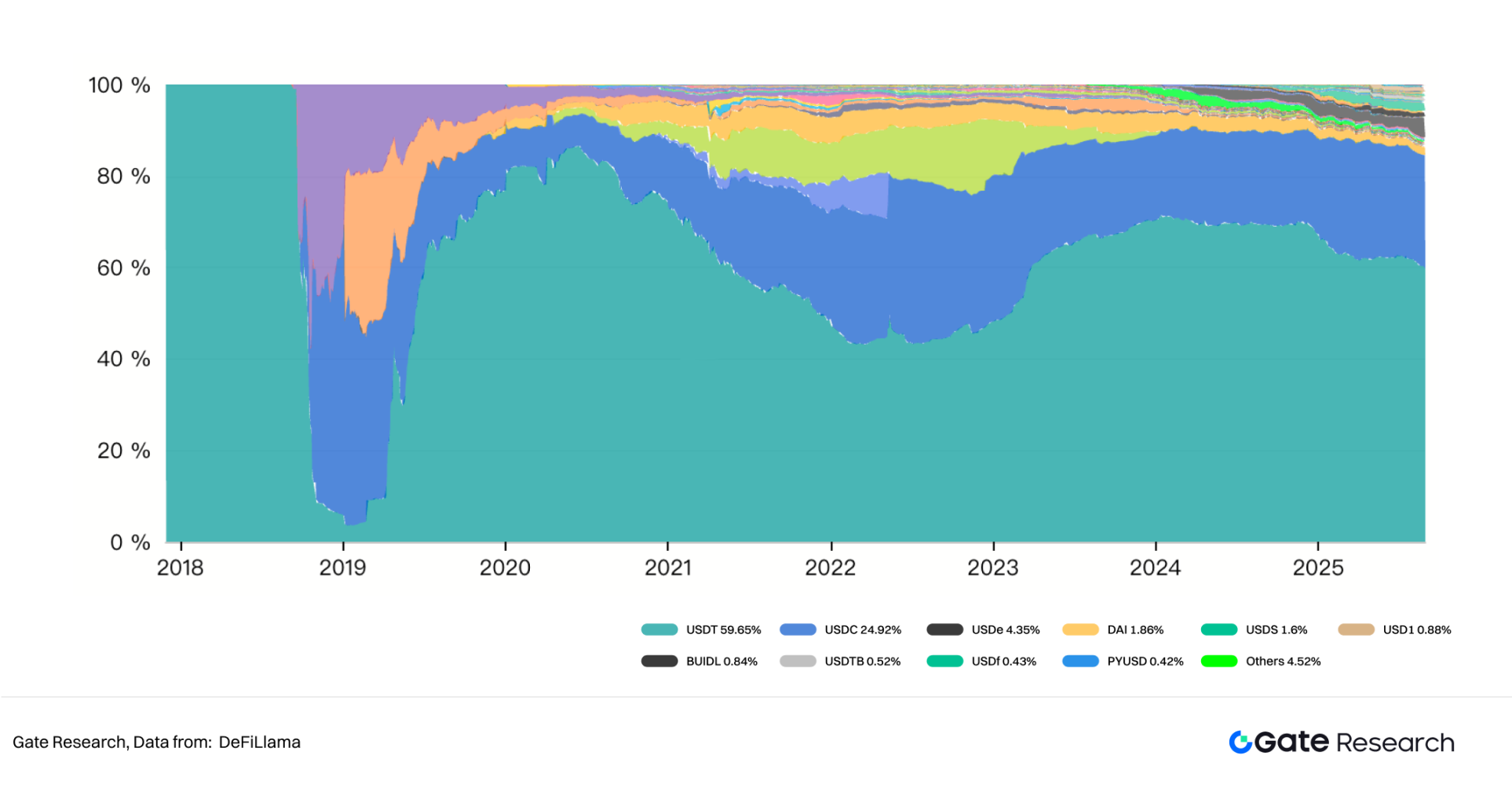 第一阶段(2014–2018),以法币托管型稳定币为主导,典型代表是 Tether (USDT)。这一时期,稳定币通过 1:1 美元储备支撑价值,强调价格稳定和流通性,主要服务于中心化交易所(CEX)的交易需求。USDT 迅速占据市场主导地位,为加密市场提供了可靠的交易媒介和流动性基础。