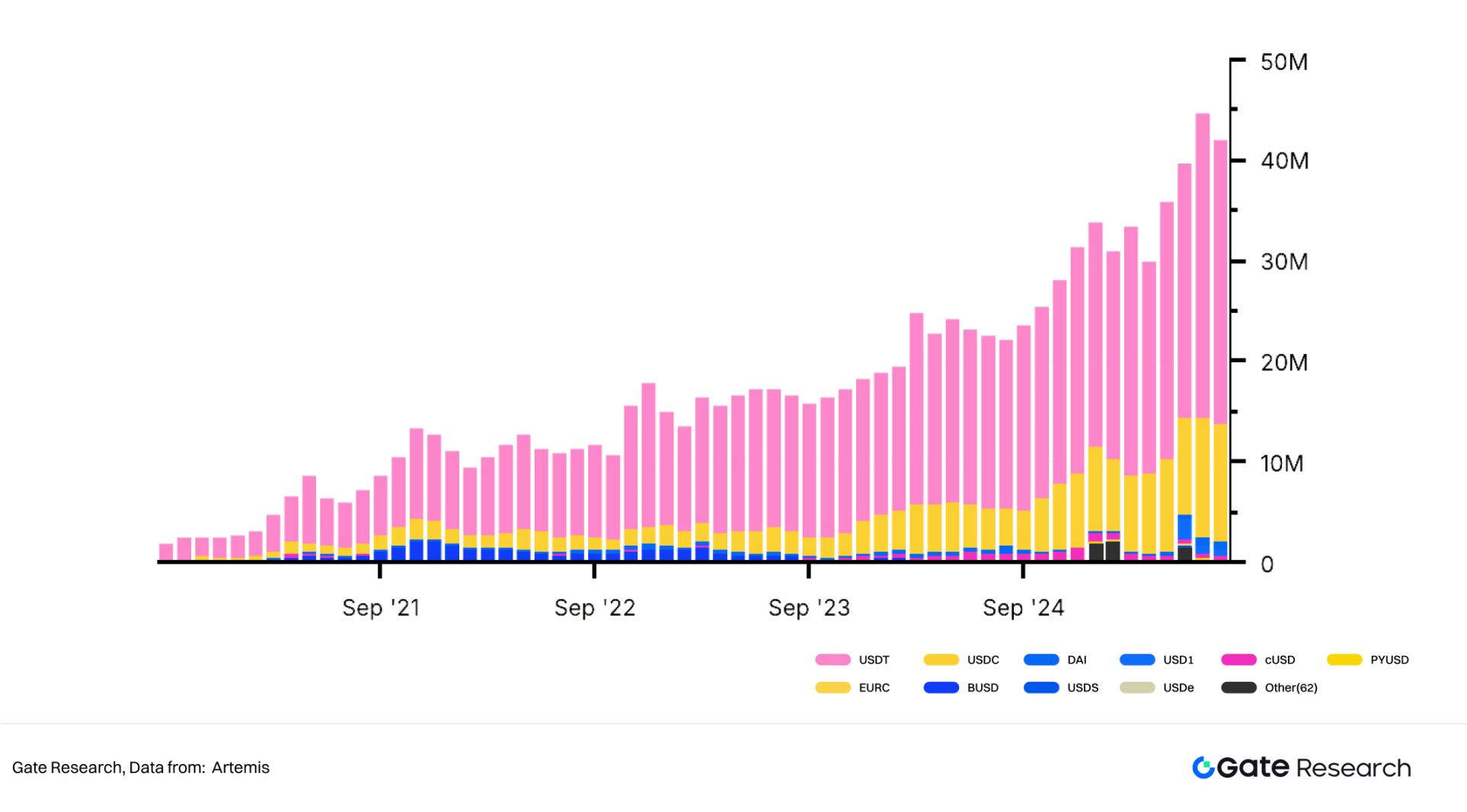 市场活跃度与规模同步攀升。稳定币的月活跃地址已超过 4,200 万,比 2023 年增长了近三倍。月链上交易笔数也已突破 11 亿,用户基础从专业交易者大规模扩展到了普通支付用户,这标志着稳定币网络已成长为一个真正意义上的全球支付体系。