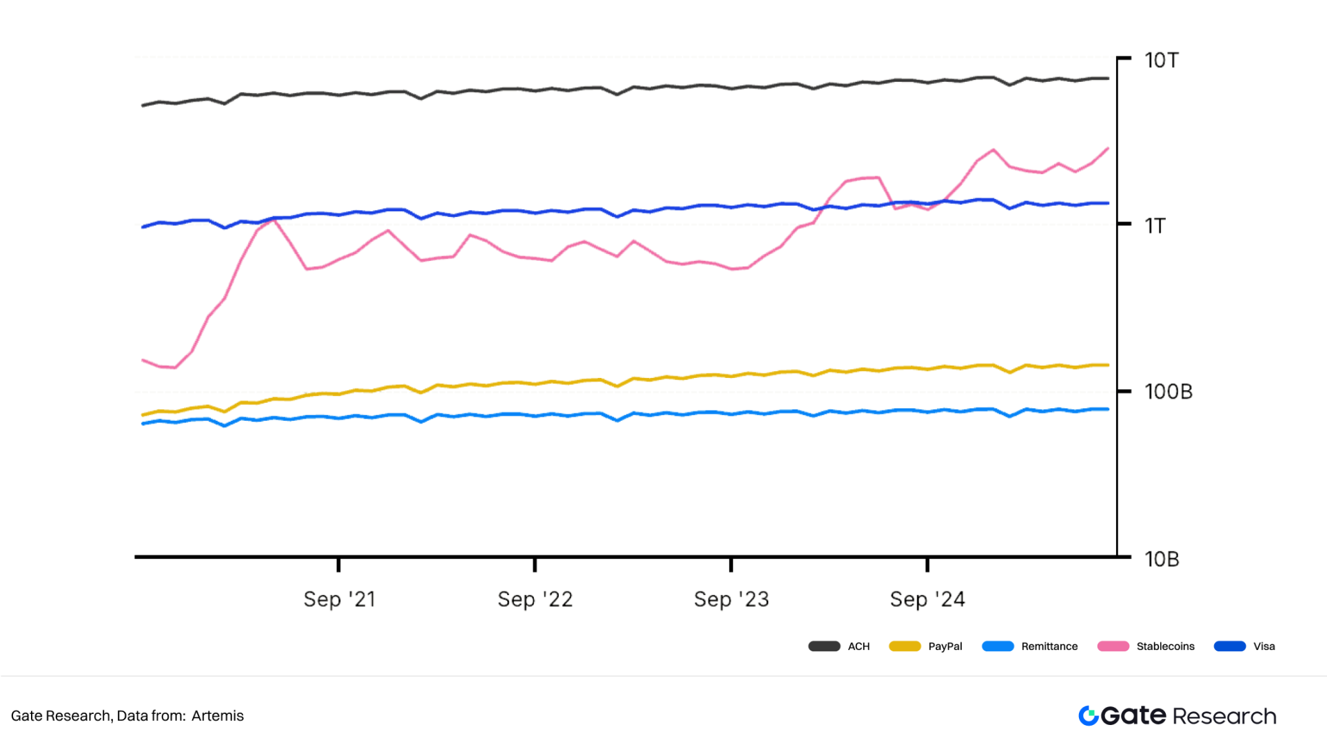 根据 Artemis 的调整后交易量数据(30 天滚动平均,不包括 MEV 活动与中心化交易所内部结算),稳定币网络的结算体量早已大幅超越 PayPal,自 2024 年起更是频繁超越 Visa。目前,它已成为仅次于传统 ACH(自动清算中心)的全球第二大支付体系,一个新时代的支付基础设施基石已然成型。