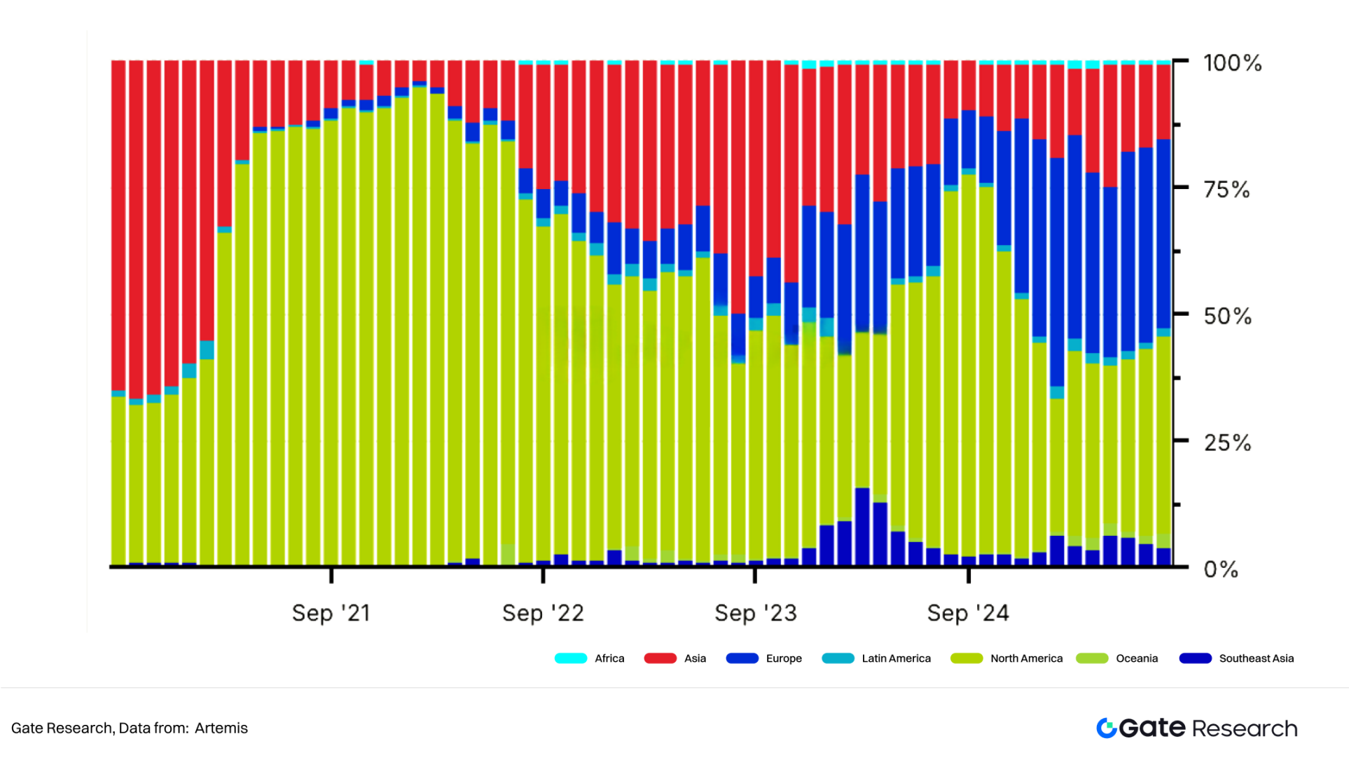 ● 欧洲:受益于 MiCA 法案带来的监管清晰度,欧洲市场份额迅速攀升,目前已达到 37.4%,几乎与北美平分秋色,成为机构合规采用的另一大核心。