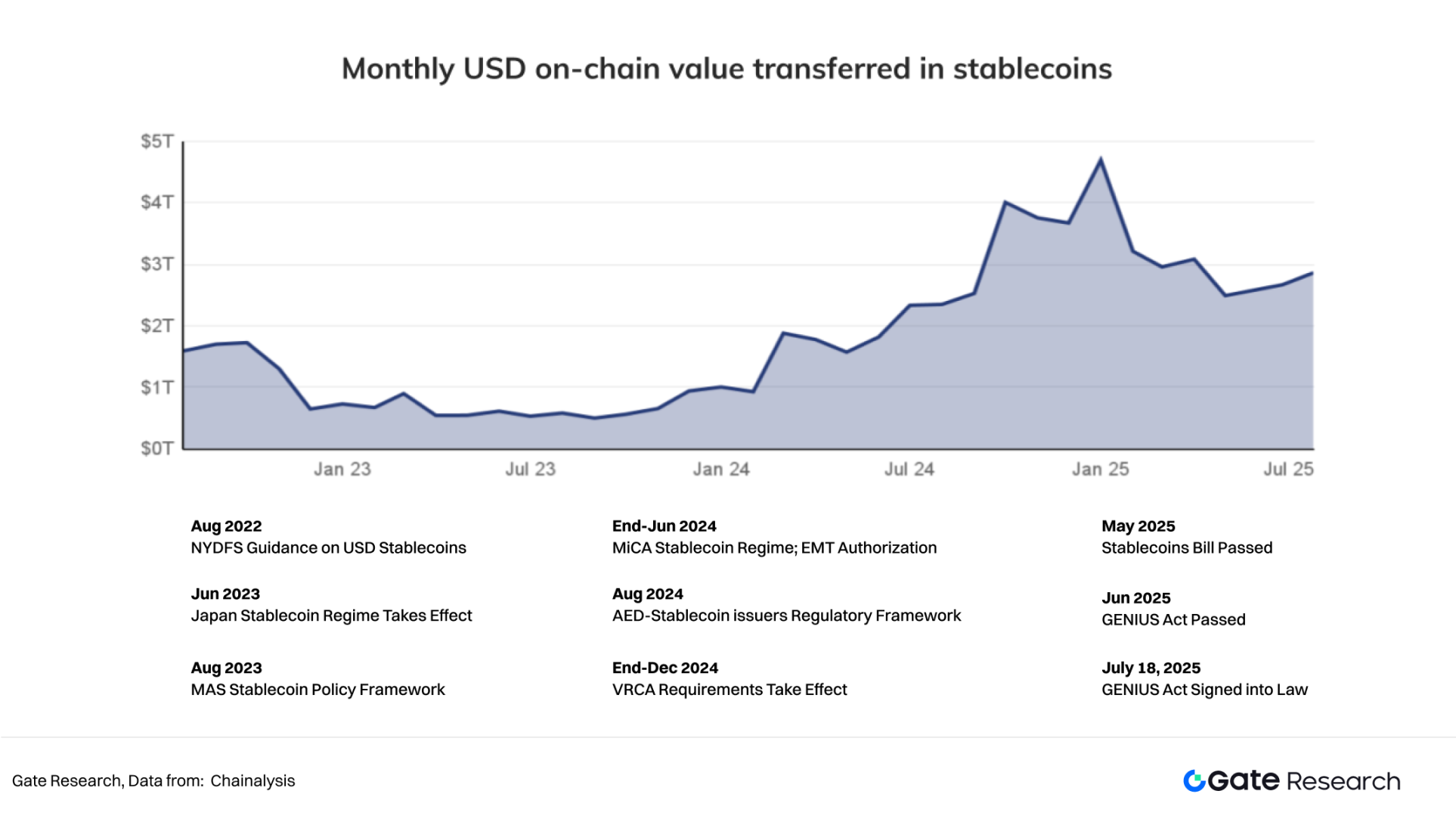 然而,稳定币的崛起并不只是技术演进的结果,而是政策驱动与市场结构性转向的共同产物: