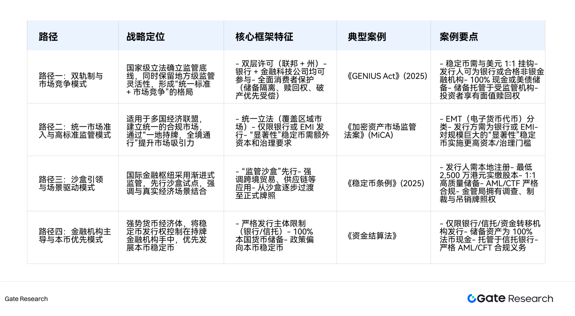 在遵守“1:1 高质量储备、强制赎回权、透明审计”等核心共识的基础上,全球主要经济体根据其金融体系的成熟度、战略目标和创新文化,并未采取统一的监管范式,而是演进出了四条各具特色的差异化监管路径。