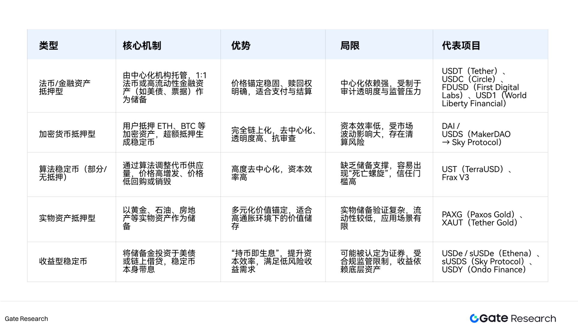 稳定币能够发展至今,源于其独特定位:通过与法定货币或高流动性资产挂钩,它在价格剧烈波动的加密市场中提供了避险与流动性支撑,并逐渐成为 DeFi、交易所和链上支付的核心资产。最早的 Tether(USDT)诞生于 2014 年,其“1 USDT = 1 USD 储备”的模式开创了稳定币时代。此后,法币储备型、加密资产抵押型、算法型与收益型等多样化稳定币不断涌现,持续拓展其在全球金融中的应用边界。