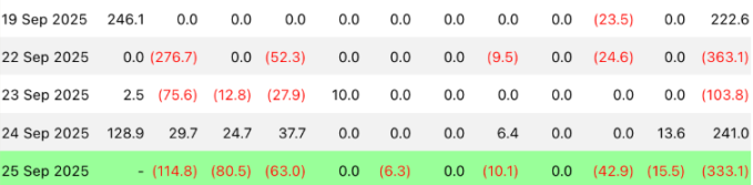 據 SoSoValue,9/24 比特幣現貨 ETF 淨流入約 2.41 億美元,以貝萊德 IBIT 領銜。新增需求支撐逢低買盤,推動價格重測 113–114k。