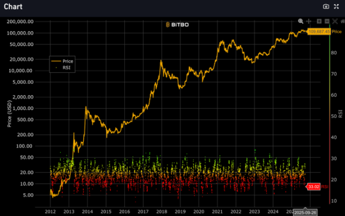 據 Bitbo,9/26 比特幣 14 日 RSI 為 33.02,接近超賣閾值(<30)。顯示短線具一定反彈空間,但賣壓仍重。RSI 全週走低,動能偏弱;若跌破 30,將強化超賣訊號。