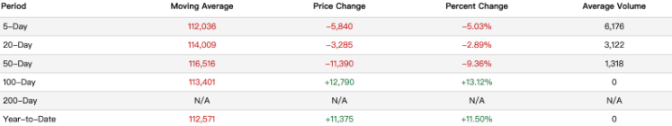 BTC 跌於 MA5、MA20、MA50、MA100 之下,空頭排列明確。短期 MA5 下行加速並死叉 MA20,強化空方優勢;中期 MA20、MA50 俯斜,賣壓延續。除非重返 MA20(約 $114,000)上方,偏空結構不變。