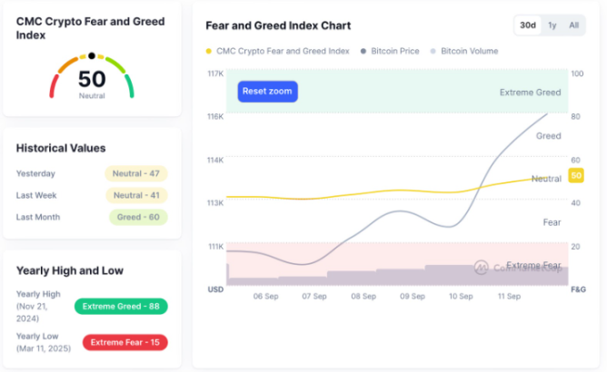 9/20–9/26 日度讀數:48、48、47、40、39、41,區間 32–48。情緒隨價波動而顯著起伏。