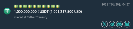 9/20,Whale Alert 追蹤到 Tether 在以太坊增發 10 億 USDT;過去 8 日累計增發 50 億,短線有助於流動性與情緒。