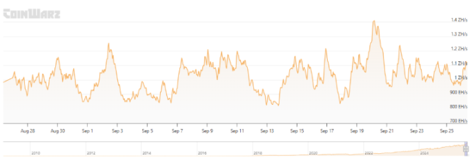 圖表顯示自 ATH 回落至較低帶(約 1.0–1.2 ZH/s)。9/20–9/26 期間未有難度重定:CoinWarz/YCharts 顯示難度自 9/18 調整後維持約 142.34T。日度波動更多來自礦工開停機與礦池隨機性,而非協議變更