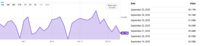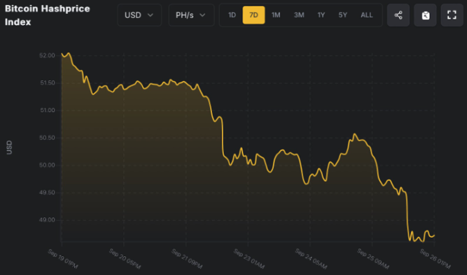 整體趨勢下行,受 BTC 波動、算力變化與費用走弱影響。Hashrate Index 顯示 9/26 Hashprice = $48.71/PH/s/ 日,週內低點 $48.60(9/26)。